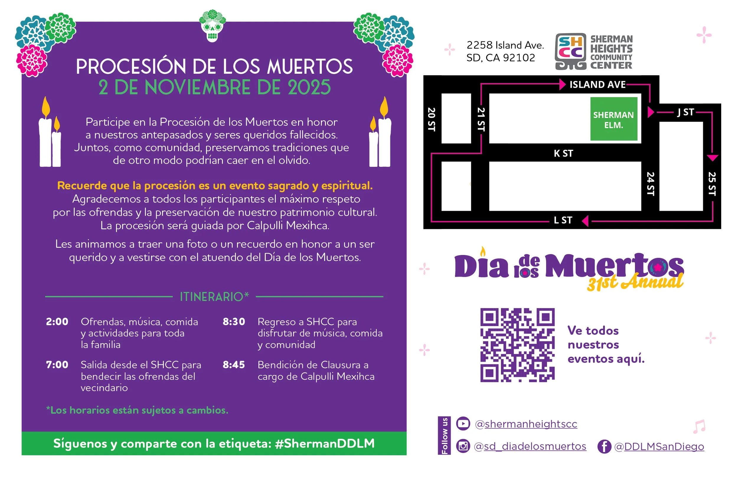 Recuerde que la procesión es un evento sagrado y espiritual. Agradecemos a todos los participantes el máximo respeto por las ofrendas y la preservación de nuestro patrimonio cultural. La procesión será guiada por Calpulli Mexihca. Les animamos a traer una foto o un recuerdo en honor a un ser querido y a vestirse con el atuendo del Día de los Muertos.